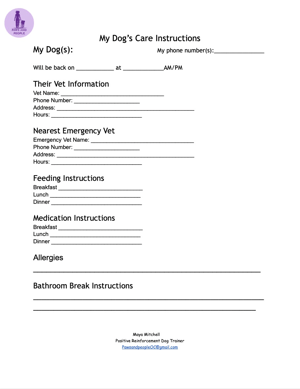 We’ll send the full form straight to your inbox! This has been so helpful for dog sitters, and gives pet parents peace of mind that their sitter knows what to do in any circumstance!