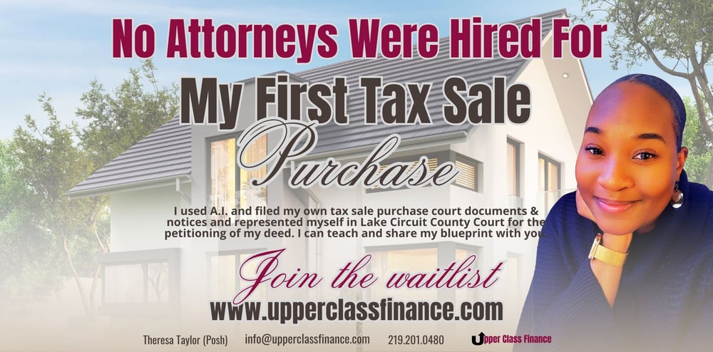 This course is for educational purposes only and does not constitute legal advice. The instructor is NOT an attorney. All examples are based on Lake County, Indiana tax sale procedures and personal experience in acquiring a tax sale auction deed to a property bided on in Lake County, IN, without hiring any attorneys to do so, and representing herself as a pro se litigate in court. Participants are responsible for verifying compliance with Indiana law and Lake County court requirements.